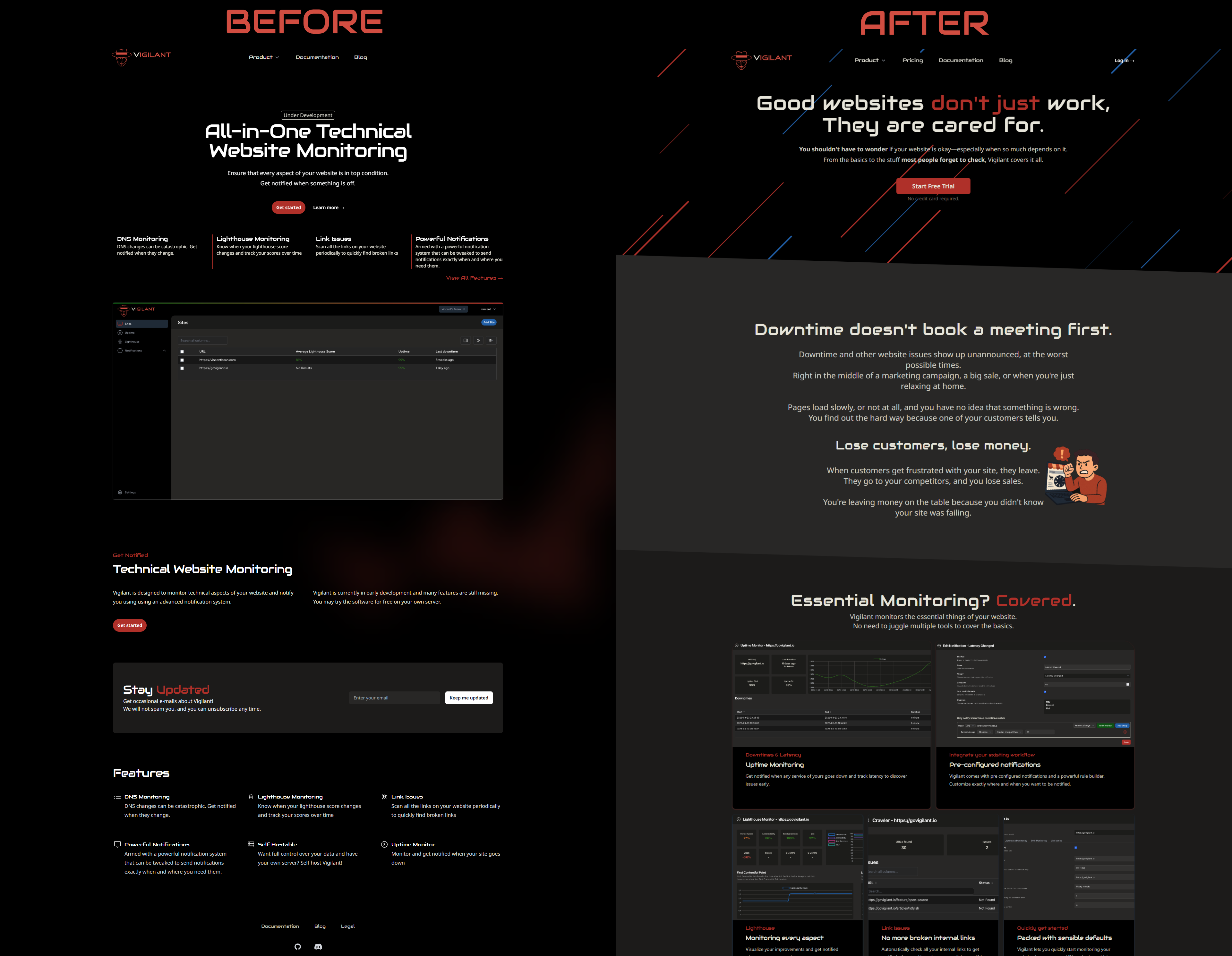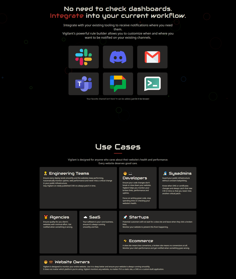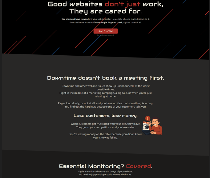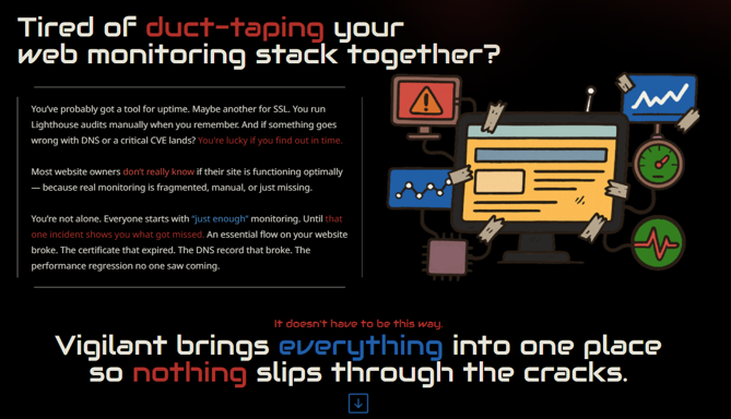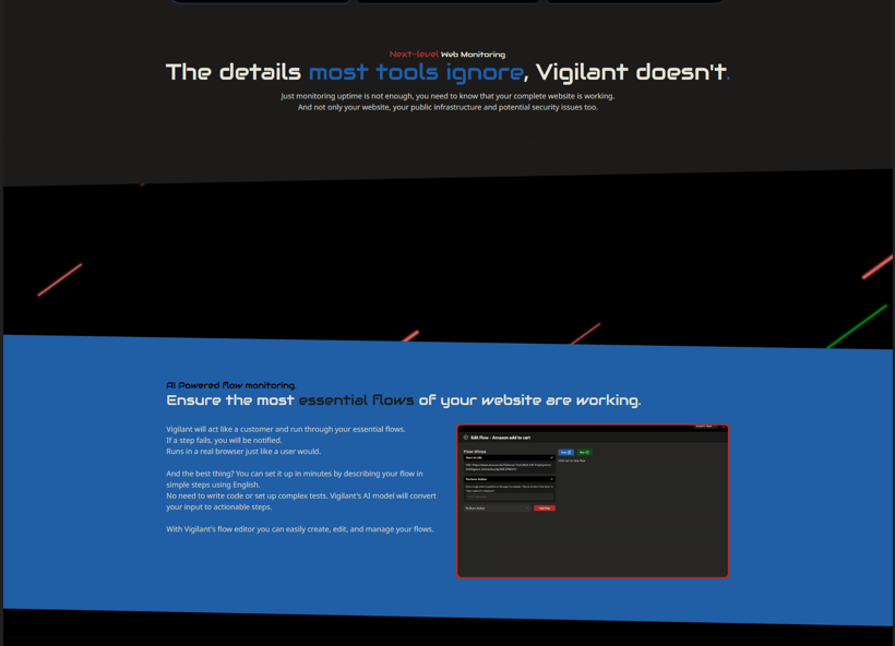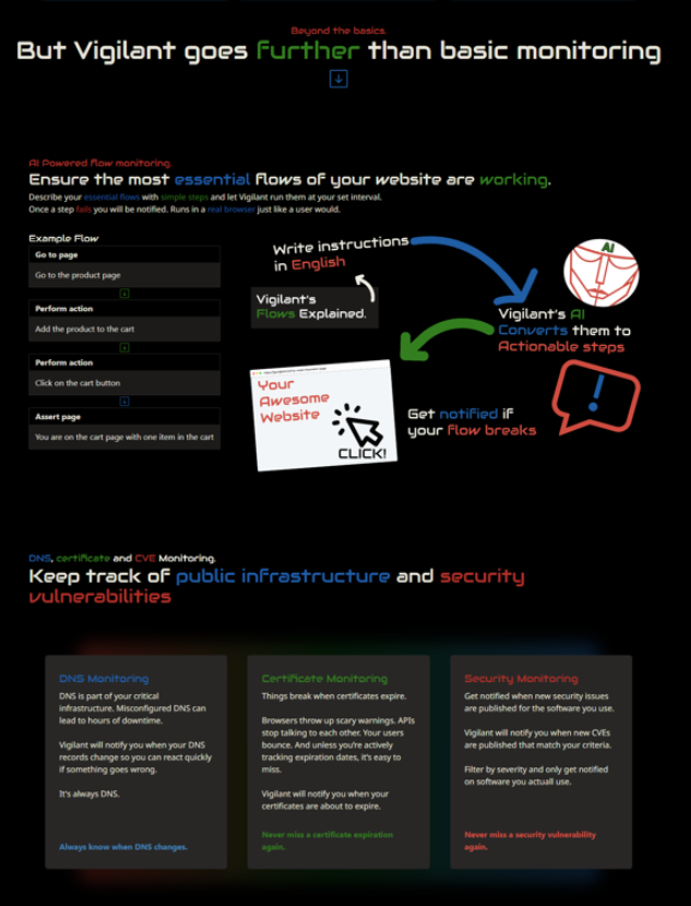 I've built Vigilant, a monitoring tool designed to monitor all aspects of your website. From basic uptime checks to more advanced checks like performance. user flows and public infrastructure. It started as an open source project and is now a SaaS using the open core structure.