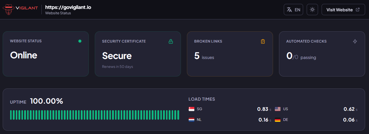 Clients want to see how their website is performing, but giving them access to your monitoring dashboard is not an option. Manually collecting screenshots and metrics wastes time and looks unprofessional. Vigilant lets you create shareable, token-protected dashboard pages that display live monitoring data for a specific site. Your clients get a professional view of their website health, and you save hours of reporting work. Live data. Secure access. Zero effort.