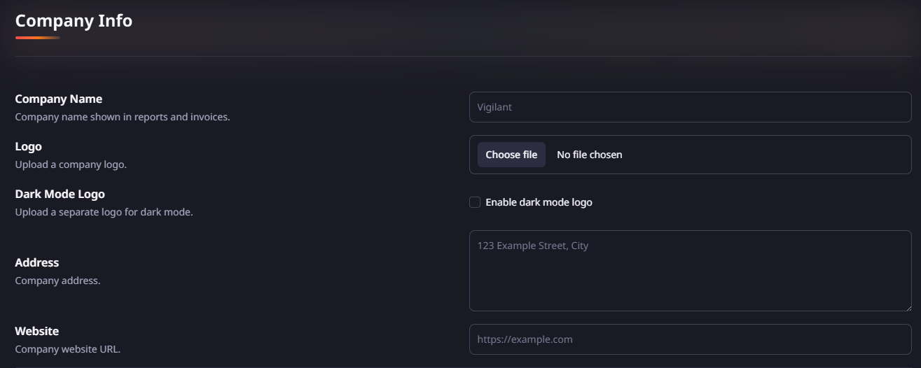 White label every client page with your own logo, company name and website through the company info settings. Upload both a light and dark logo variant and Vigilant automatically shows the right one based on the visitor's color scheme. Your clients see your brand, not ours.