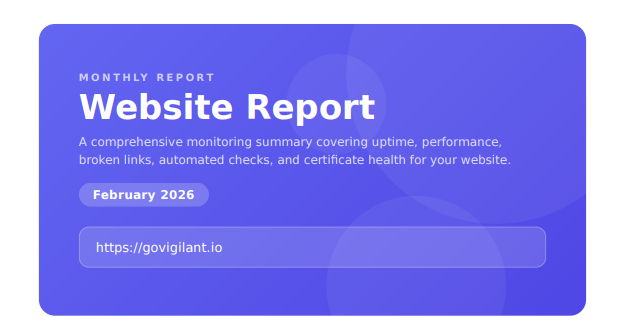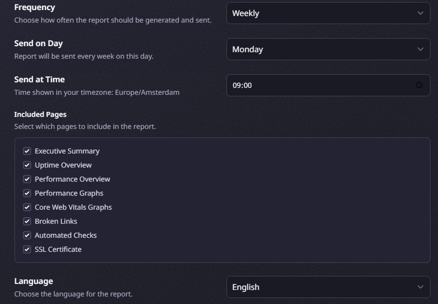 Schedule reports on a weekly or monthly basis. Pick the day and time that works best for your recipients. Vigilant generates the PDF and sends it automatically, no manual effort required. The schedule respects your team timezone so reports arrive exactly when expected.