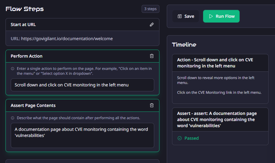 Create flows by writing simple English sentences. Run flows instantly in the editor to verify each step works. No DOM selectors, no code, no technical knowledge required. Just describe what customers do and Vigilant handles the rest.
