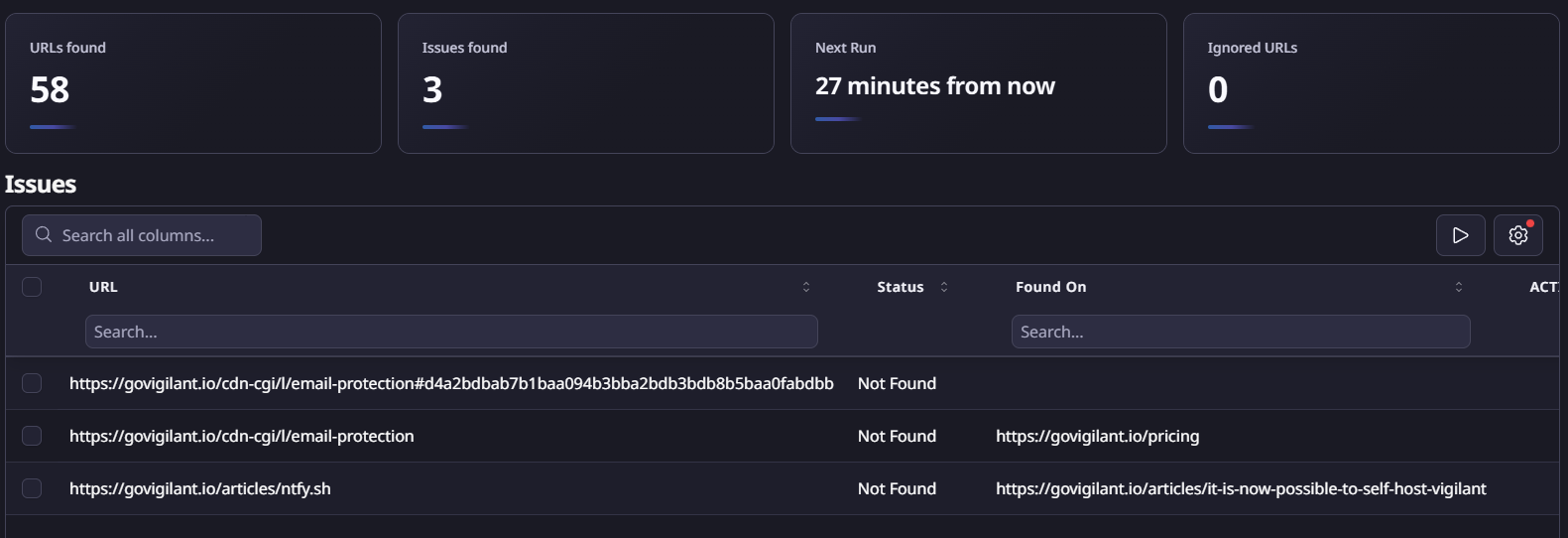 Vigilant crawls your entire site and sitemap automatically, catching broken links the moment they appear. Fix issues before they cost you customers and search rankings.
