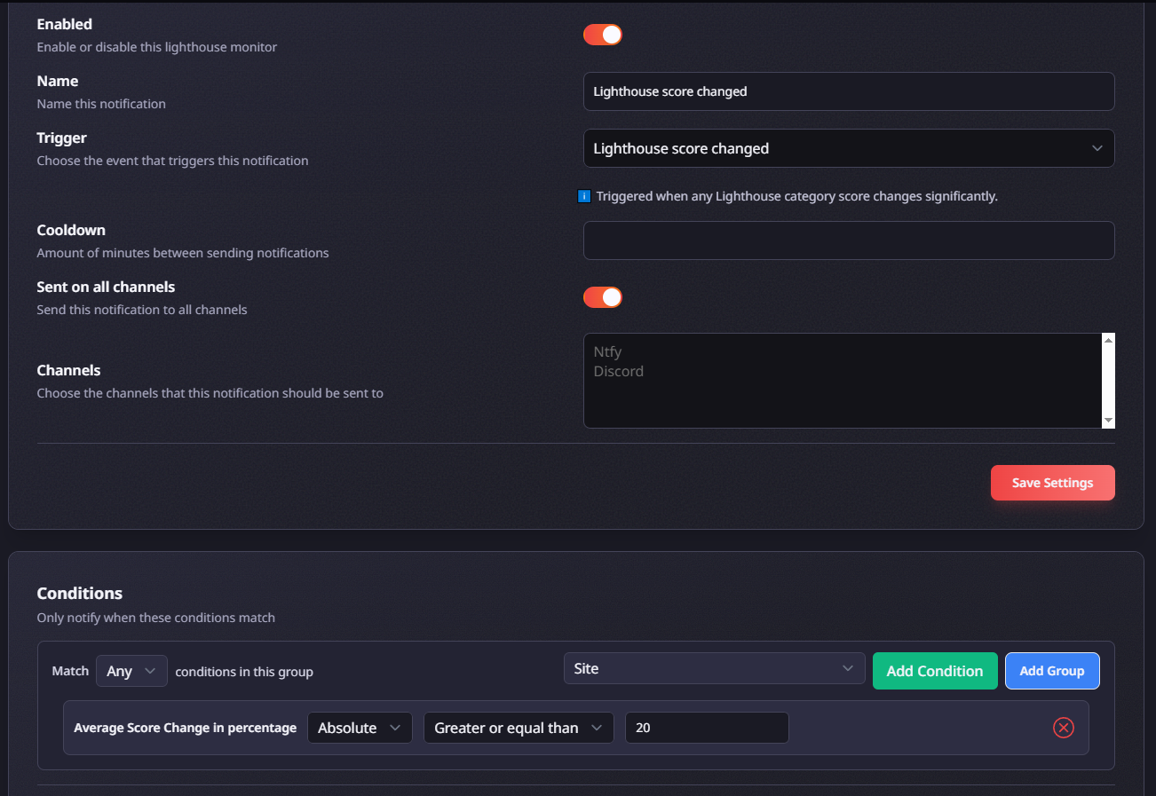 Advanced condition engine lets you trigger alerts only when specific thresholds are crossed, like a 20% drop in performance scores or DNS record changes on production domains. Eliminate noise, surface only what matters.